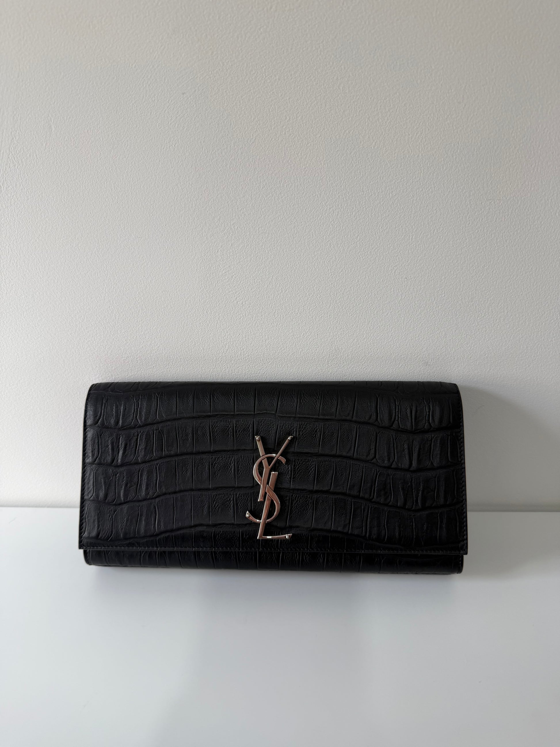 Preloved, black leather crocodile embossed cassandra clutch bag.